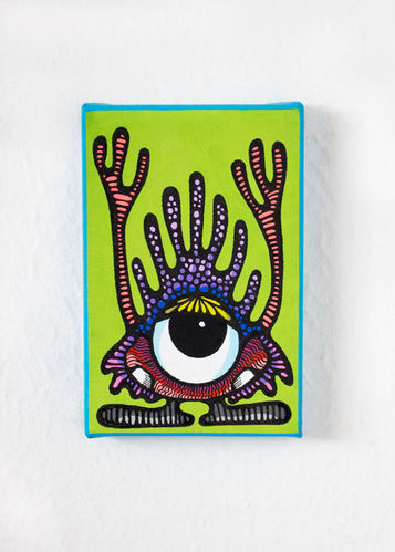 Pequeños mundos contenidos en cada lienzo. Son pinturas/dibujos donde los colores sólidos se fortalecen gráficamente para generar un impacto instantáneo en quien los observa, y, después de ese impacto, dan la bienvenida a un universo de texturas y detalles superpuestos a los colores, creando este nuevo mundo dentro de un espacio reducido.